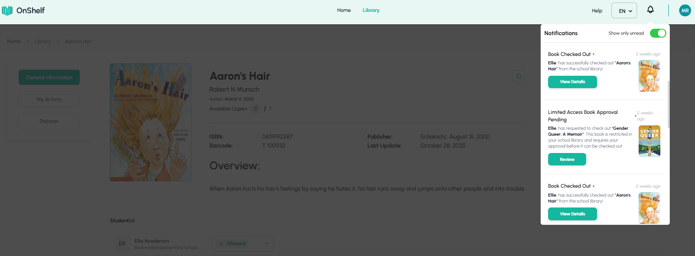 - Parents receive a notification email when a student in their household successfully checks out a book.