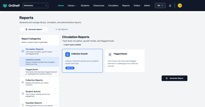 Click on a category — for example, Circulation Reports — to expand its options. You'll see types like Collection Growth and Flagged Books.