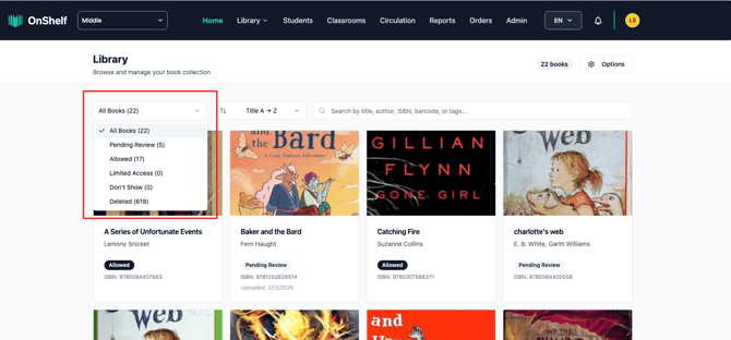 You'll see all your books displayed as cards, each showing the book's cover, title, author, and a status badge. The filter dropdown at the top lets you view books by status: