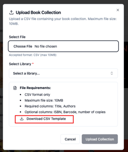 A dialog will open where you can upload a CSV file to add multiple books at once. You'll see a "Download CSV Template" displayed in the dialog to use for the required file format and column headers .