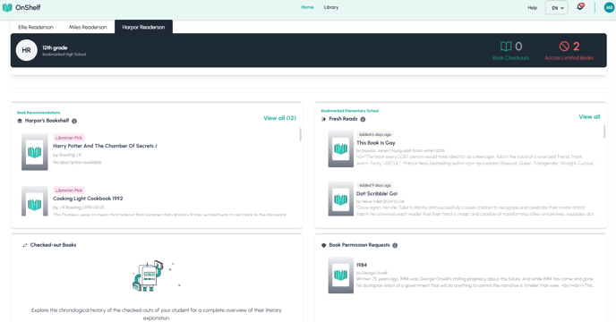 The OnShelf Home Page is your central dashboard for monitoring and managing the library access and literary journey for all of your children. The entire page is dynamic; the information you see changes based on which child you have selected.