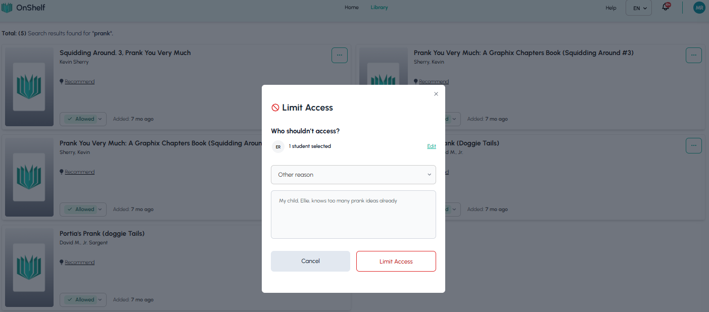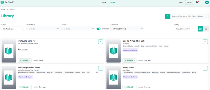 The Library page in your OnShelf portal is a powerful tool that allows you to browse your child's complete school library catalog (including both the main library and individual classroom libraries). Most importantly, it gives you direct control to manage access to specific books for each of your children, ensuring a safe and appropriate reading experience.